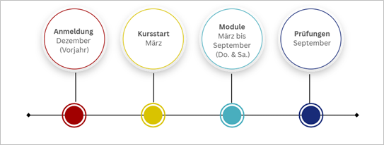 Kurstage wöchentlich einmal am Donnerstag oder Samstag alternierend. Keine Kurses während der Sommerferien. Es sind mehrere Blockkurse Freitag/Samstag vorgesehen.